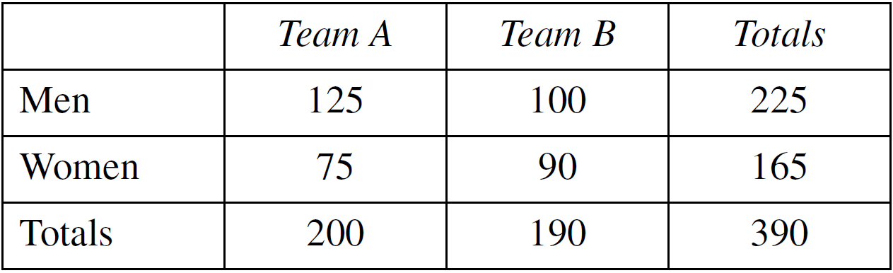 Some men and women were surveyed at a football game. They were asked which team they supported. The results are shown in the two-way table.
