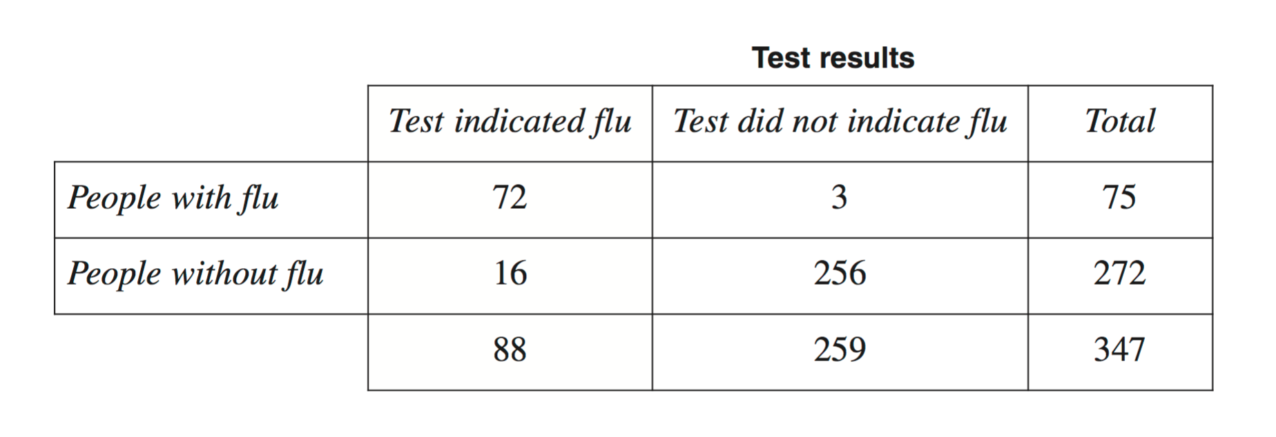 A group of 347 people was tested for flu and the results were recorded. The flu test results are not always accurate.