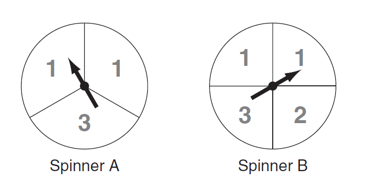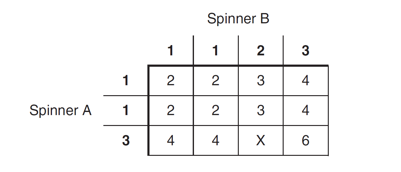 - On Spinner `B`, a 2 is obtained. What is the probability of obtaining a score of 3? (1 mark)
