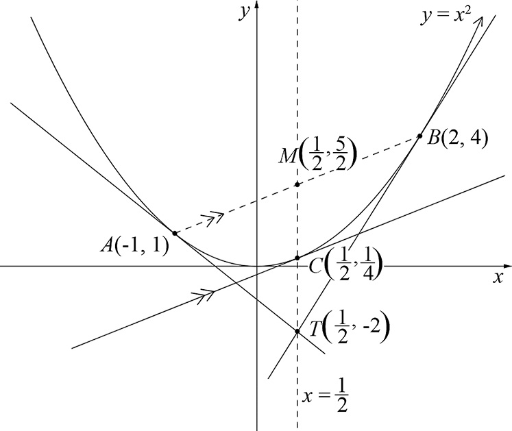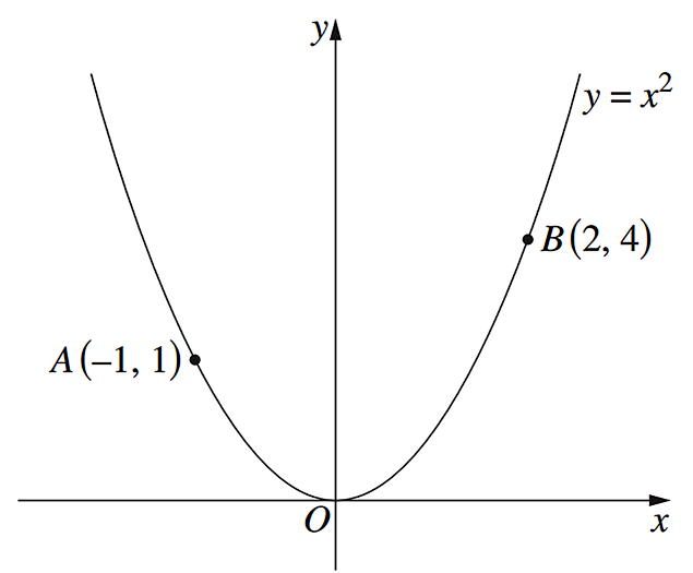 The parabola shown in the diagram is the graph `y = x^2`. The points `A (–1,1)` and `B (2, 4)` are on the parabola.